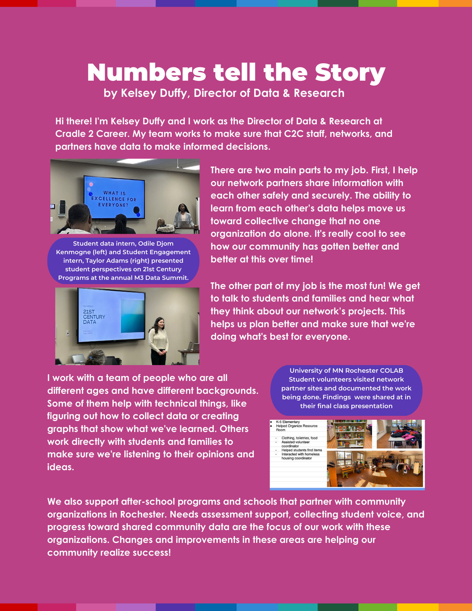 When students feel a sense of belonging in school, it positively impacts their academic success, school engagement, and mental well-being. Cradle 2 Career (C2C) collaborated with Rochester Public Schools (RPS) to address this issue. They organized the first Annual Student Data Summit on April 26, 2023. This event aligned with the vision of both C2C and RPS. It allowed students to discuss and explore their sense of belonging within their respective schools. The summit aimed to involve students in analyzing data, identifying potential reasons for the data, and generating ideas to improve the data.