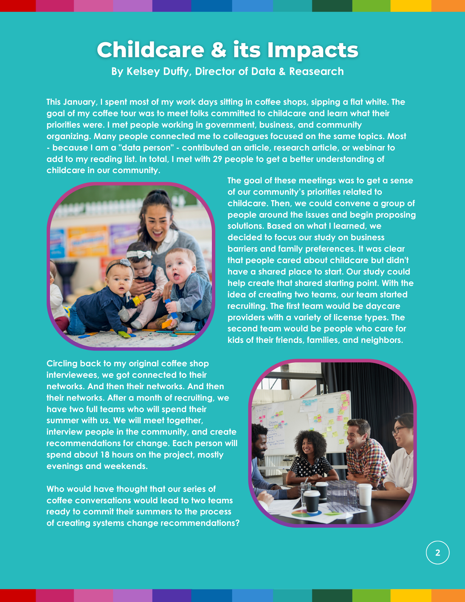 This January, I spent most of my work days sitting in coffee shops, sipping a flat white. The goal of my coffee tour was to meet folks committed to childcare and learn what their priorities were. I met people working in government, business, and community organizing. Many people connected me to colleagues focused on the same topics. Most - because I am a "data person" - contributed an article, research article, or webinar to add to my reading list. In total, I met with 29 people to get a better understanding of childcare in our community.