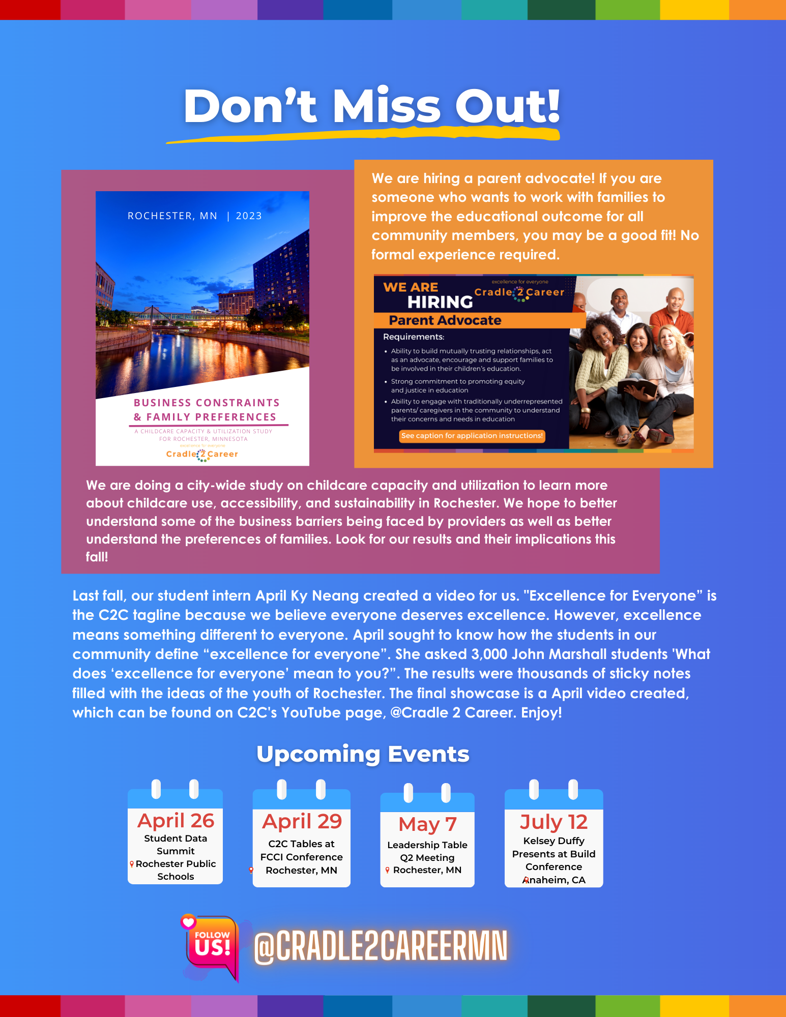 Happy Summer! If you are like me, spring zipped by in a blink and here we are at the end of June! For the last few months, we have been working on a planning and visioning process for Cradle 2 Career (C2C). What we heard was that many know our name but cannot speak to what we do. People asked us to refine our elevator speech, to take action on quick, visible wins and to build out a plan for the future. And, that is what we are doing! We are: